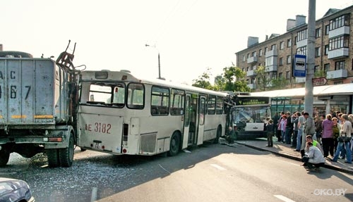 А щитом для нескольких десятков брестчан послужил 16 мая автобус МАН-240 1986 года выпуска, принадлежащий ИЧУТП «АПП Шетле». За рулем находился 38-летний Сергей Чешко, в салоне – 15 пассажиров, направлявшиеся на работу в одно из предприятий СЭЗ «Брест». В утренний час пик автобус осуществлял посадку пассажиров на многолюдной остановке «Проспект Машерова». А по встречной полосе, задевая легковые иномарки, на скорости несся к остановке новенький троллейбус с разлетевшимися «рогами». Большинство пассажиров автобуса отделались легким испугом, поскольку сидели на местах. Помощь понадобилась мужчине, который, видимо, как раз заходил в салон и сильно ударился. И он, и все прочие пассажиры, а также десятки людей на остановке могут с полным правом присоединиться к выводу Сергея Чешко: повезло. Все грозило обернуться гораздо хуже, ведь случилось так, что 10,5-тонной махиной троллейбуса никто не управлял и по проспекту Машерова она перемещалась по собственной, если можно так сказать, прихоти. Как же случилось, что новехонький «МАЗ» с бортовым номером 115, следовавший по 4-му маршруту, уподобился «летучему голландцу»? В этом вопросе предстоит разбираться экспертам и сотрудникам ГАИ, их решение пока не вынесено. А свидетельства очевидцев позволяют воссоздать картину происшествия из следующих деталей. И только благом можно назвать то обстоятельство, что штанги-токоприемники все же отсоединились сами и троллейбус свернул с попутной полосы движения, где мог натворить бед перед светофором. Конечно, с этим не согласятся водитель встречного троллейбуса и хозяева трех легковушек, двигавшихся от перекрестка к Кобринскому мосту. Машины пострадали от столкновения, а неуправляемую «четверку» уже несло к остановке «Проспект Машерова», где удар принял на себя автобус. Его развернуло почти поперек проезжей части, в тыл впечатались мусоровоз и служебная «Газель», доведя количество участников ДТП до восьми… К счастью, все люди живы, два человека (мужчина 1970 года рождения и пожилая женщина) получили легкие телесные повреждения и госпитализации не подвергались. Сотрудники МЧС помогли рассоединить слившиеся в рискованном «поцелуе» кабины троллейбуса и автобуса. Последний покинул место происшествия своим ходом, первый – с помощью «КрАЗа»… Естественно, в данной ситуации логично ставить вопрос о возмещении материального ущерба. По словам директора троллейбусного парка Леонида Гапасюка, побывавшего на месте происшествия, гражданская ответственность транспорта предприятия застрахована. Теперь страховой компании предстоит урегулировать вопрос по возмещению ущерба, нанесенного другим участникам движения виновником столкновения. По правилам, застрахованными считаются и все пассажиры общественного транспорта, в данном случае развозного автобуса. Ждет своей участи и 115-й «борт». По улицам нашего города суперсовременная разработка столичных автозаводцев, которая стоит 374 миллиона рублей, проездила всего две недели, сейчас ее предстоит восстанавливать, скорее всего – в Минске. Сегодня нет достаточных оснований, чтобы говорить о соотношении человеческого фактора и объективных предпосылок для возникновения ЧП. С одной стороны, претензий к К., водителю с 10-летним стажем работы в парке, у руководства ранее не было, на новые машины в любой организации пере