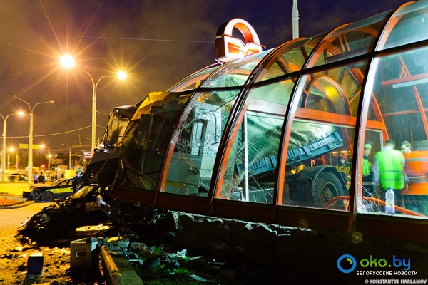 Фура, столкнувшись с легковыми автомобилями, въехала на остановочный пункт и сбила мужчину (1953 г.р.), сидевшего на скамейке. Его увезли в Больницу скорой помощи с диагнозом черепно-мозговая травма, переломы рёбер и ног. Потом грузовик въехал в зону второго вестибюля и наехал на выходящую из метро молодую девушку (1992 г.р.), студентку минского ВУЗа. Спасатели при помощи гидравлического инструмента спасли девушку и направили в больницу. |